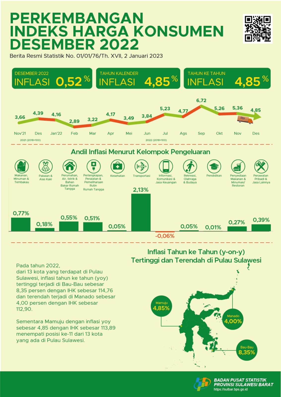 Kepala BPS Sulbar, Tina Wahyufitri saat memaparkan, berdasarkan hasil Survei Harga Konsumen dari 90 kota di Indonesia, pada bulan Desember 2022, inflasi year on year (yoy) tertinggi terjadi di Kota Baru sebesar 8,65 persen dengan IHK sebesar 119,83 dan terendah terjadi di Sorong sebesar 3,26 persen dengan IHK sebesar 110,95. Dan di Mamuju sendri mengalami Inflasi sebesar 4,85 persen dengan IHK sebesar 113,89.