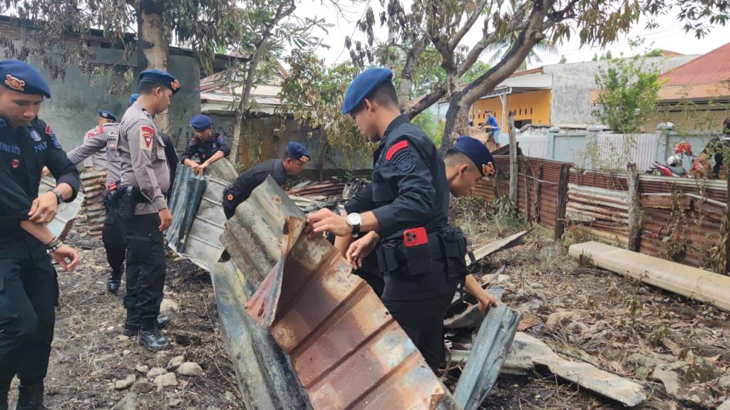 Personel Brimob Bone hadir lengkap mengenakan seragam dinas dipimpin Danki 1 AKP Darfin Tahrir, terjun membersihkan puing-puing sisa kebakaran yang terjadi di Jl. Pasinringeng, Kelurahan Biru, Kecamatan Tanete Riattang, Kabupaten Bone.