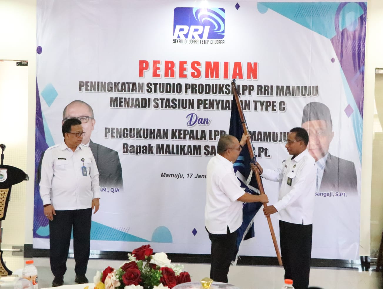 Penyerahan pataka RRI oleh Kepala RRI Makassar, Edi Ivan kepada Kepala RRI Mamuju, Malikam Sangaji sebagai bentuk rangkaian diresmikannya Studio Produksi LPP RRI Mamuju Menjadi Stasiun Penyiaran Tipe C sekaligus pengukuhan kepala RRI Mamuju yang baru.