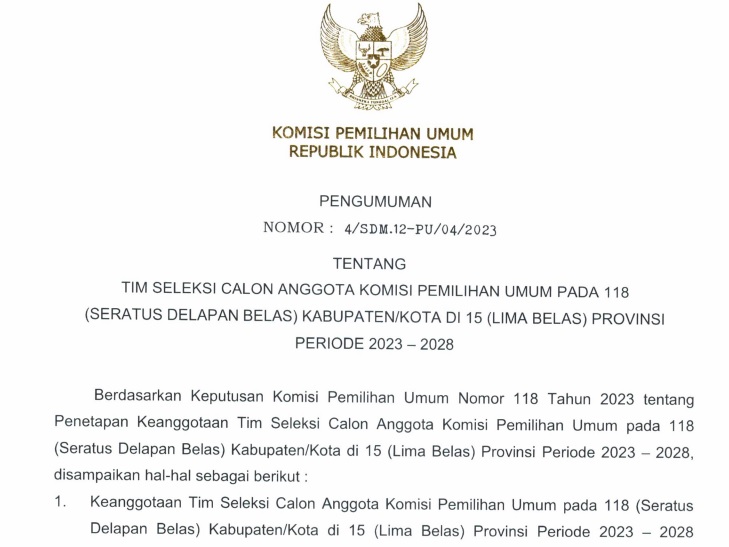 Hal itu, berdasarkan pengumuman KPU-RI Nomor : 4/SDM.12-PU/04/2023, tentang Tim seleksi calon anggota komisi pemilihan umum pada 118 (seratus delapan belas) kabupaten/kota di 15 (lima belas) provinsi!
