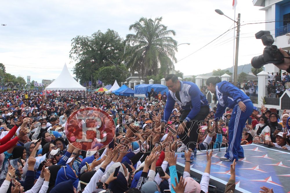 Terlihat AHY didampingi istri. Tampak antusias warga Mamuju ikut senam bersama anak mantan Presiden Susilo Bambang Yudhoyono (SBY) itu.