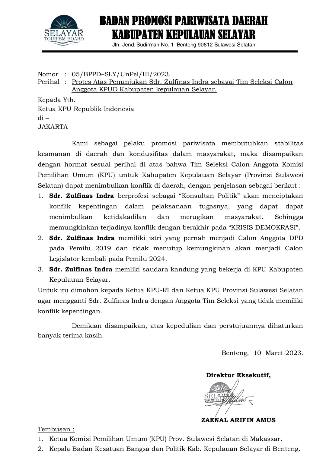 “Kami sebagai pelaku promosi pariwisata membutuhkan stabilitas keamanan di daerah dan kondusifitas dalam masyarakat, penunjukan zulfinas sebagai Timsel KPU Selayar dapat menimbulkan konflik di daerah” jelasnya dalam surat itu.