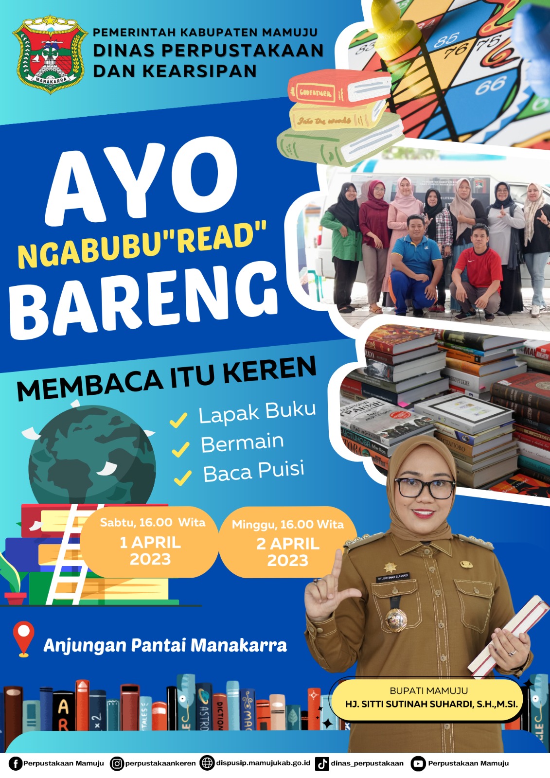 MAMUJU, RAKYATSULBAR.COM —- Dinas Perpustakaan dan Kearsipan Kabupaten Mamuju menghadirkan giat pekan literasi dengan tema Ngabubu”Read” yang akan dilaksanakan pada sabtu 1 April dan minggu 2 April 2023 di anjungan pantai Manakarra Mamuju.