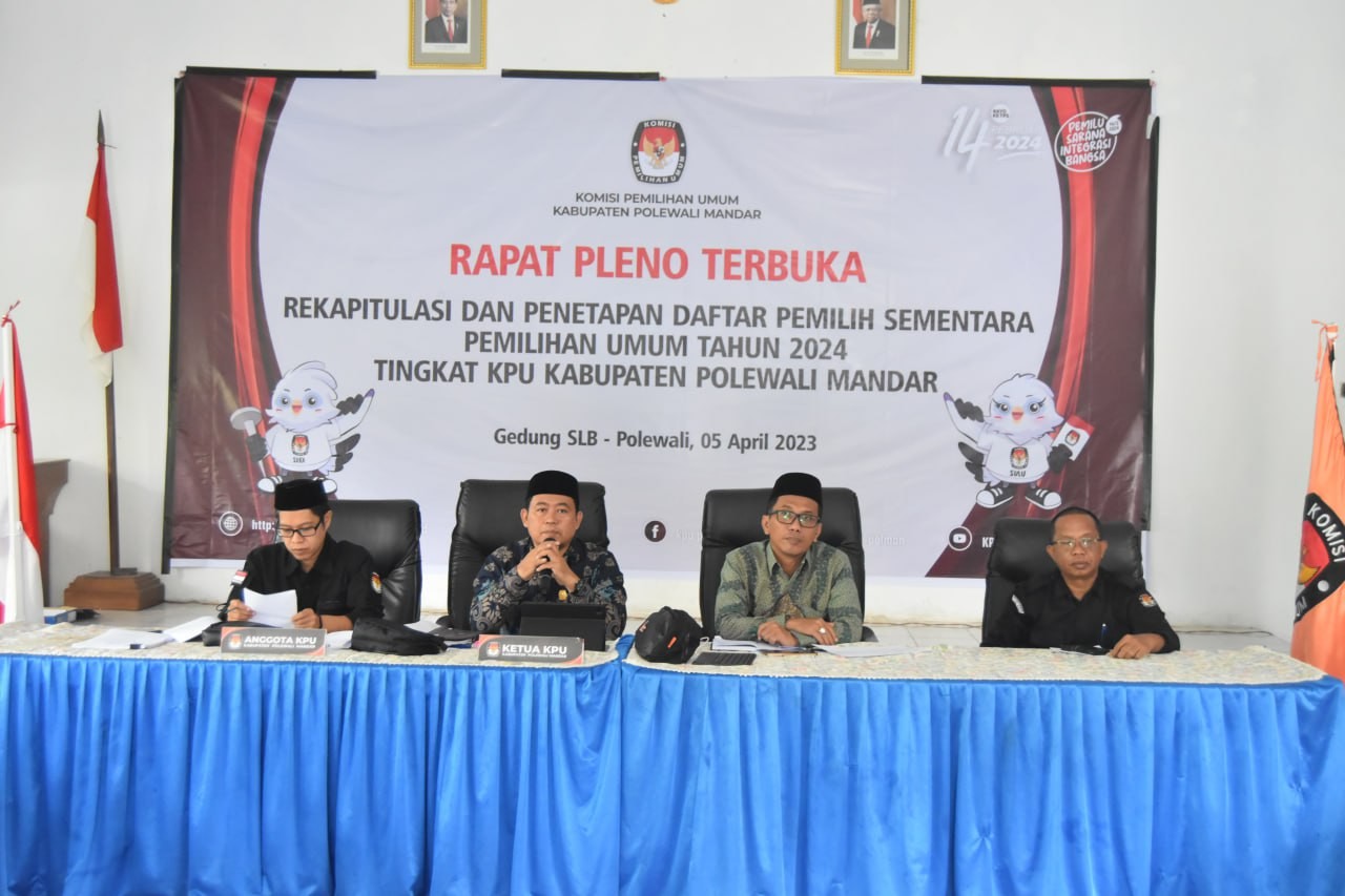 POLMAN, RAKYATSULBAR.COM -Komisi Pemilihan Umum (KPU) Kabupaten Polewali Mandar (Polman) menggelar rapat pleno terbuka Rekapitulasi dan penetapan Daftar Pemilih Sementara (DPS) hasil pemutakhiran dalam Pemilu tahun 2024 di Aula SLB Jl. KH. Hasyim No 05 Pekkabata Kecamatan Polewali. Rabu (5/4).