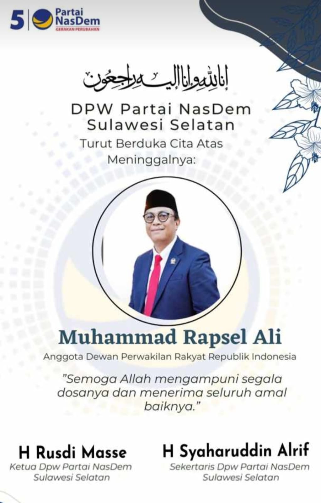 “DPW NasDem Sulsel turut berduka cita. Almarmuh kader terbaik NasDem, tentu kami kehilangan sosok terbaik,” kata Sekretaris DPW NasDem Sulsel, Syahruddin Alrief.