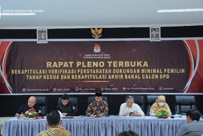MAMUJU, RAKYATSULBAR.COM — Komisi Pemilihan Umum (KPU) Provinsi Sulawesi Barat (Sulbar) menggelar rapat pleno terbuka Rekapitulasi Verifikasi Persyaratan Dukungan Minimal Pemilihan Tahap Kedua dan Rekapitulasi Akhir Bakal Calon DPD. Pleno tersebut digelar di Aula Kantor KPU Sulbar, Selasa (11/4).