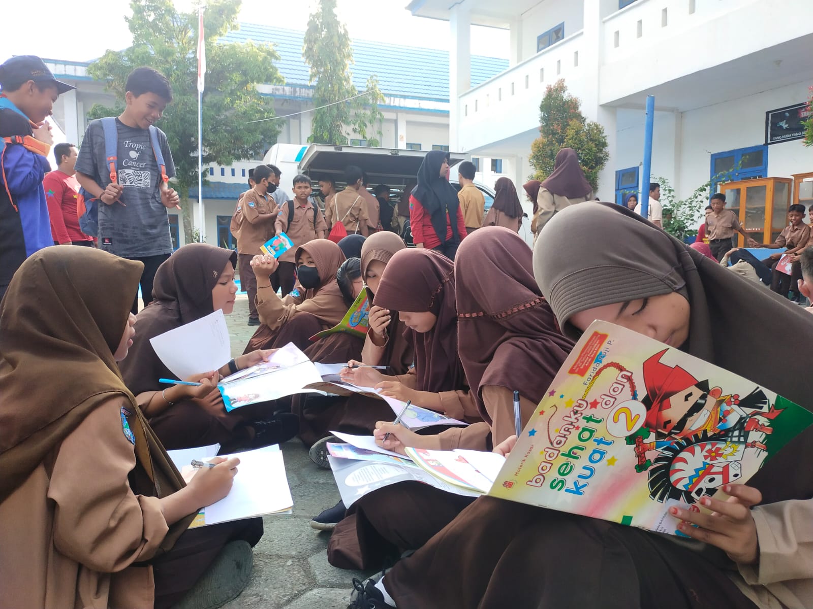 Dimana Safar literasi tersebut di gelar di halaman Sekolah, terlihat puluhan siswa siswi mulai dari Kelas 1 hingga kelas 3 ramai -ramai padati mobil perpustakaan keliling untuk mengambil buku bacaan yang ia akan baca.