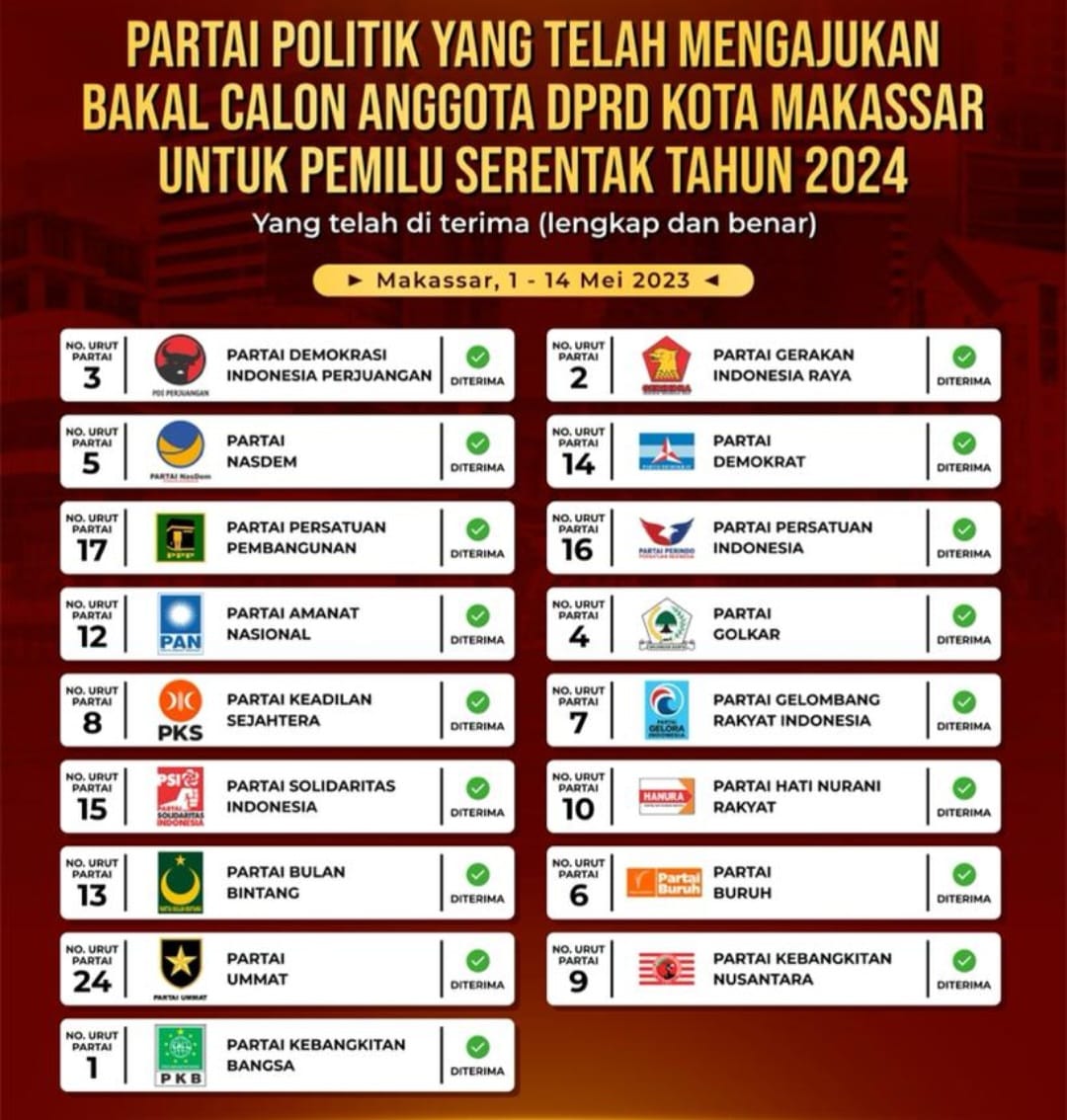 Dari total 18 partai peserta pemilu 2024 di kota Makassar. Hanya partai Garuda mengalami kendala, bahkan gagal menyetor Bacaleg di pangkalan silon KPU. Sehingga hanya 17 partai politik yang telah menyetor masing-masing 50 orang Daftar Caleg Sementara (DCS) di KPU Makassar, hingga batas waktu penutupan pendaftaran penyetor Bacaleg, Minggu (14/5) malam.