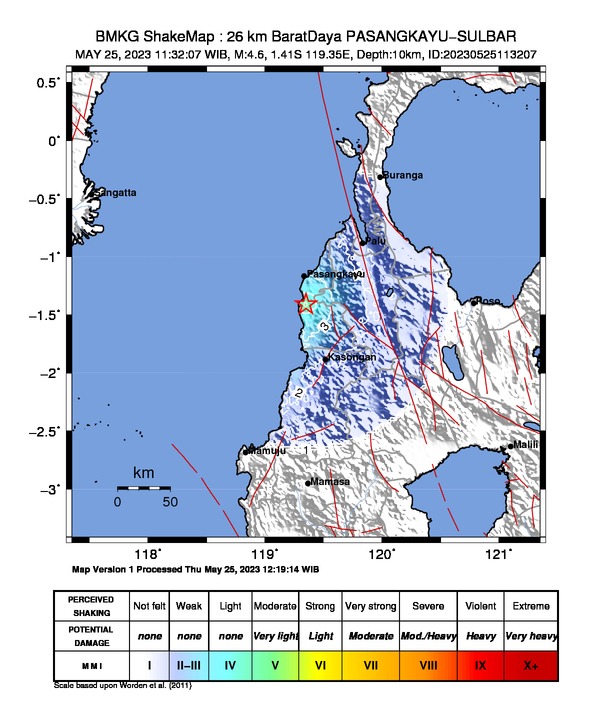 Hasil analisis BMKG menunjukkan gempa bumi ini memiliki parameter M 4.6. Episenter gempa bumi terletak pada koordinat 1.41 LS dan 119.35 BT, atau tepatnya berlokasi di darat pada jarak 26 km Barat Daya Pasangkayu-Sulbar pada kedalaman 10 km.