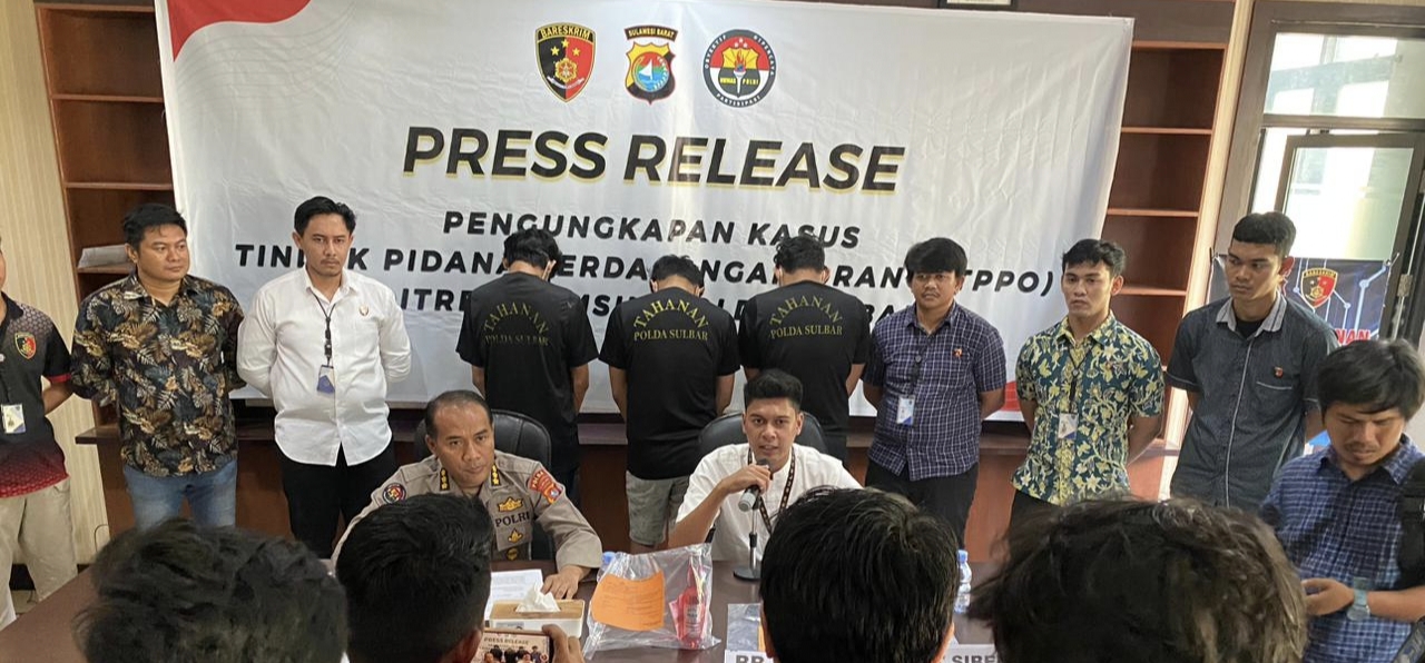 Kabid Humas Kombes Pol Syamsu Ridwan didampingi Panit Siber pada pelaksanaan press release yang, Jumat (23/6) di Aula Ditkrimsus.