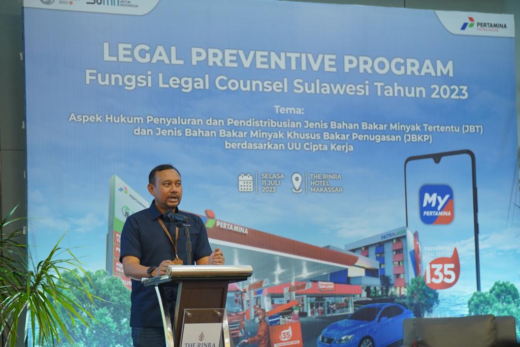 Area Manager Legal Counsel Sulawesi, Riza Fathoni, dalam sambutannya pada acara tersebut menyampaikan bahwa legal preventif merupakan kegiatan rutin yang dilakukan untuk mengedukasi para insan Pertamina yang dalam pekerjaannya bersinggungan dengan hukum.