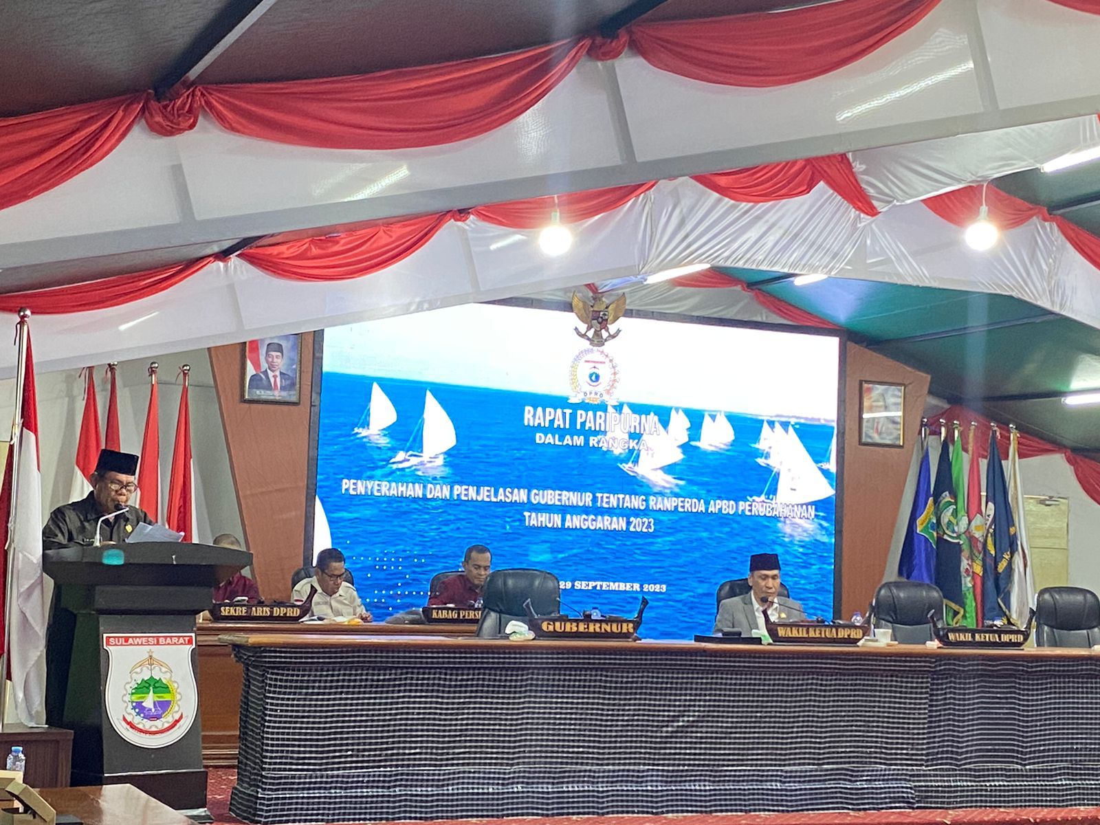 MAMUJU, RAKYATSULBAR.COM — Dewan Perwakilan Rakyat Daerah (DPRD) Sulawesi Barat (Sulbar) menggelar rapat Paripurna terkait Jawaban Gubernur Sulawesi Barat Terhadap Pemandangan Umum Fraksi-Fraksi DPRD Provinsi Sulawesi Barat atas Pengantar Nota Keuangan Ranperda tentang perubahan APBD Tahun Anggaran 2023, dilaksanakan di ruang Paripurna Sekretariat DPRD Provinsi Sulawesi Barat, Jumat (29/9).