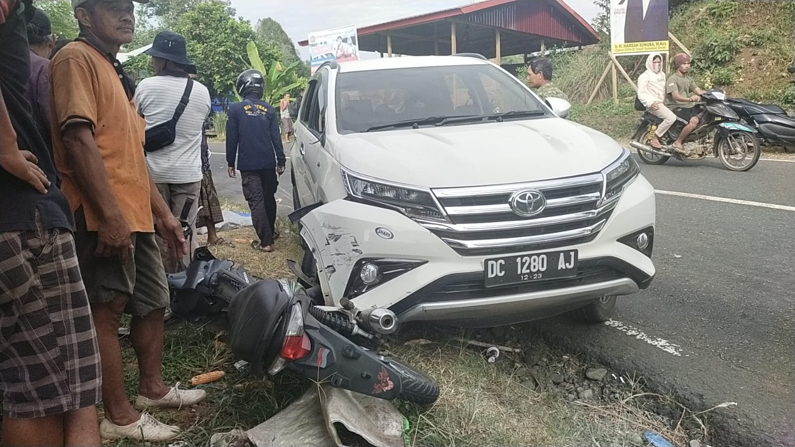Dimana pengendara roda dua dari arah Mamuju bertabrakan dengan pengendara roda empat dengan nomor polisi DC 1280 AJ dari arah Selatan. Pengedara motor tersebut diseret sekitar 20 Meter oleh mobil.