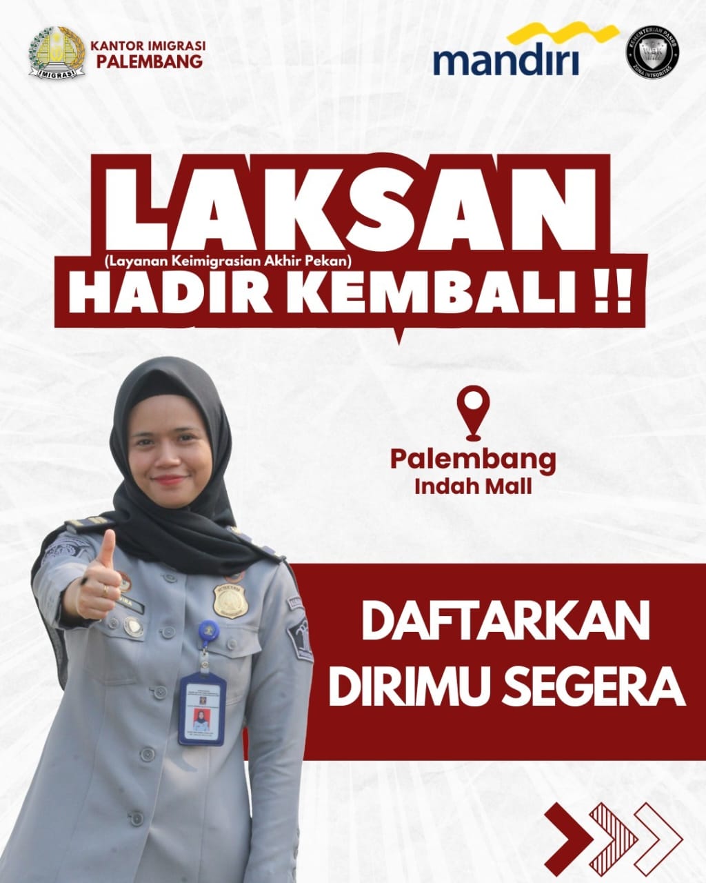 “Weekend nanti kami akan membuka layanan LAKSAN, yaitu Layanan Keimigrasian Akhir Pekan bekerja sama dengan PT. Bank Mandiri dalam rangka HUT Mandiri ke-25 tahun, di Palembang Indah Mall,” ujar Ridwan.