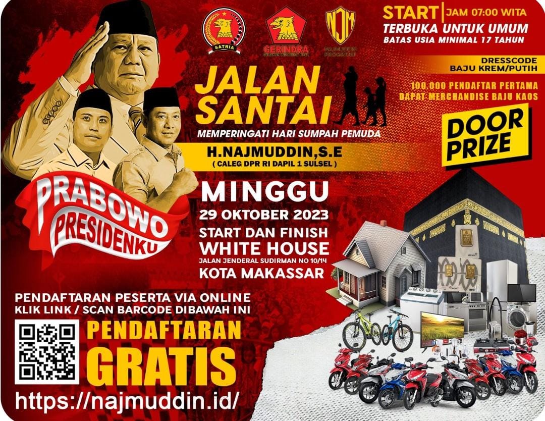MAKASSAR, RAKYATSULBAR.COM –– Menyambut Peringatan Hari Sumpah Pemuda 2023, caleg DPR RI Dapil Sulsel I, H. Najmuddin akan menggelar jalan sehat akbar bersama warga Sulsel pada umumnya.