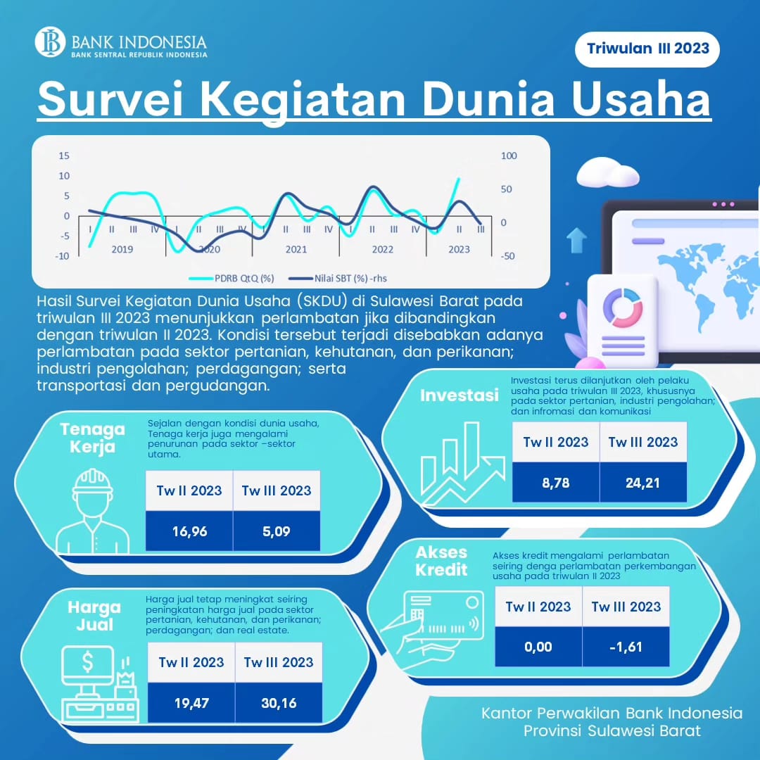 Kondisi ini sejalan dengan hasil Survei Kegiatan Dunia Usaha (SKDU) Kantor Perwakilan Bank Indonesia (BI) Provinsi Sulawesi Barat (Sulbar) yang mengindikasikan adanya perlambatan kegiatan dunia usaha pada triwulan III 2023.