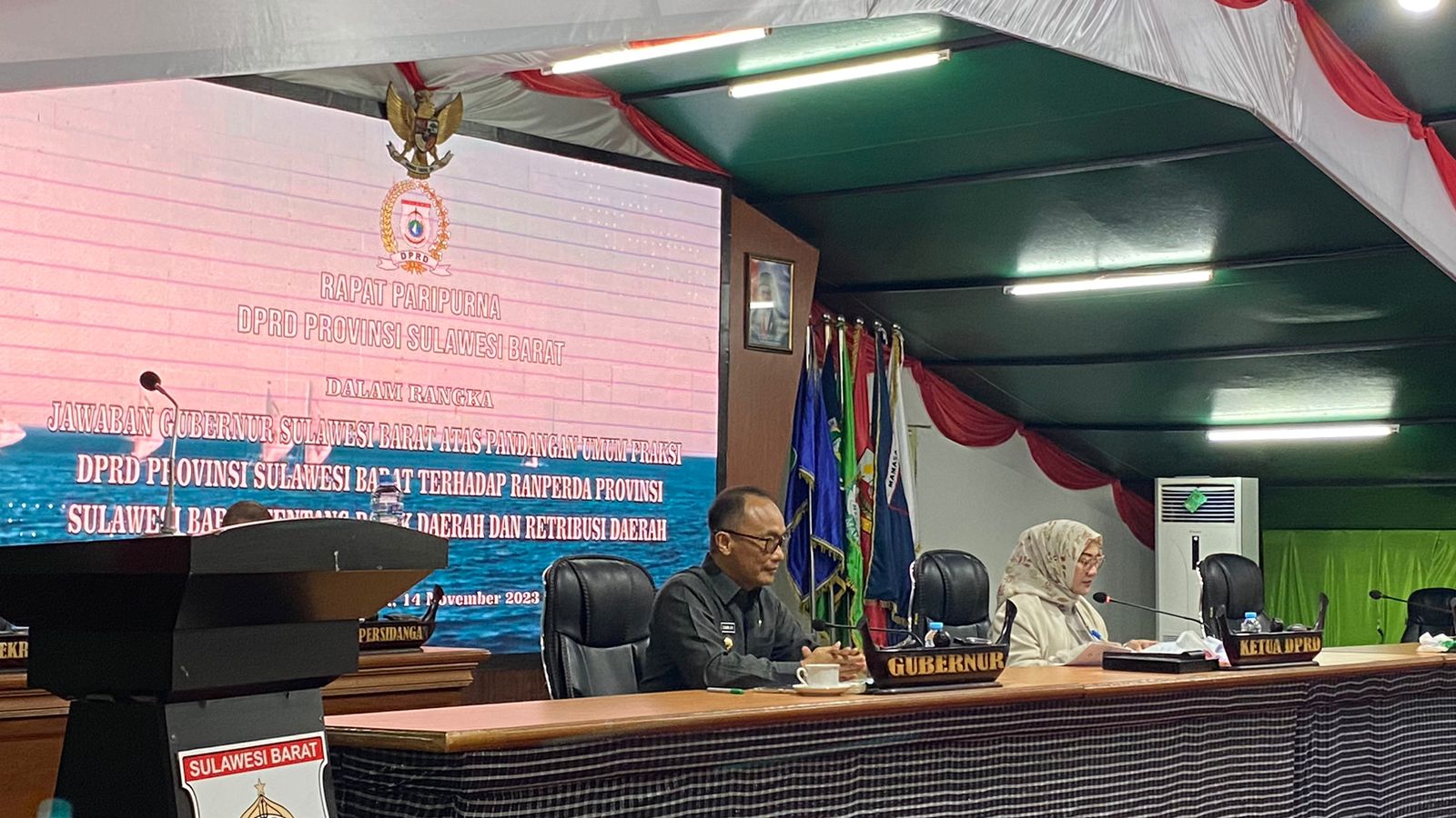 MAMUJU, RAKYATSULBAR.COM — Dewan Perwakilan Rakyat Daerah (DPRD) Provinsi Sulawesi Barat (Sulbar) menggelar rapat Paripurna dalam rangka Jawaban Gubernur Sulawesi Barat atas Pandangan Umum Fraksi DPRD Provinsi Sulawesi Barat terhadap Rancangan Peraturan Daerah (Ranperda) Provinsi Sulawesi Barat tentang Pajak Daerah dan Retribusi Daerah, dilaksanakan di Ruang Rapat Paripurna DPRD Sulbar, Selasa, (14/11).