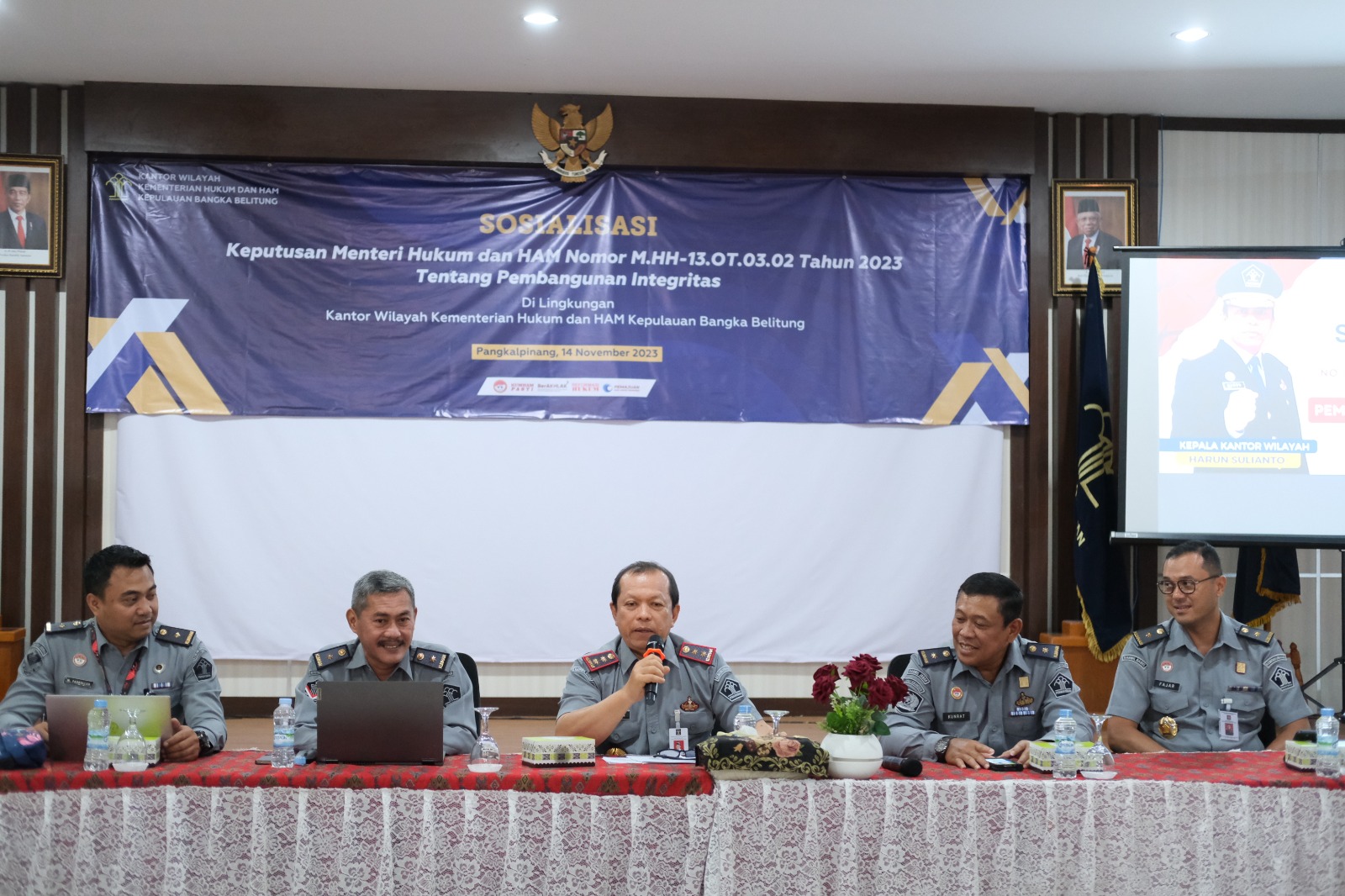 PANGKALPINANG, RAKYATSULBAR.COM- Tim Inspektorat Wilayah (Itwil) 4 Inspektorat Jenderal Kemenkumham sosialisasikan Keputusan Menteri Hukum dan HAM Republik Indonesia Nomor M.HH-13.OT.03.02 Tahun 2023 yang terbit pada tanggal 15 September 2023 tentang Pembagunan Integritas di lingkungan Kemenkumham kepada jajaran Kantor Wilayah Kementerian Hukum dan HAM Kepulauan Bangka Belitung, di Balai Pengayoman Kantor Wilayah, Selasa (14/11).