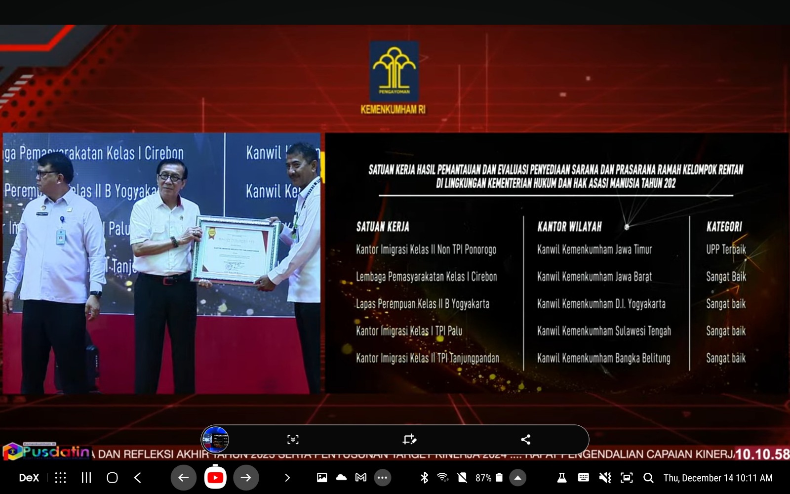 JAKARTA, RAKYATSULBAR.COM – dua Satuan Kerja Kantor Wilayah Kementerian Hukum dan HAM Kepulauan Bangka Belitung, yaitu Lembaga Pemasyarakatan Kelas IIB Tanjungpandan dan Kantor Imigrasi Kelas II TPI Tanjungpandan raih penghargaan dari Menteri Hukum dan HAM, Prof. Yasonna H. Laoly, pada kegiatan Refleksi Akhir Tahun 2023 Kementerian Hukum dan HAM, di Ballroom Hotel Borobudur, Kamis (14/12).