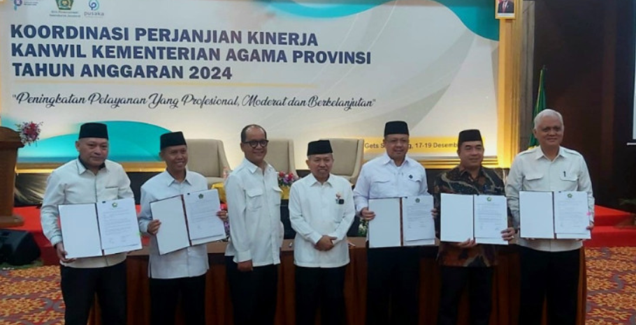 Kepala Kantor Wilayah Kementerian Agama Provinsi Sulawesi Barat Syafrudin Baderung melakukan penandatanganan dan penyerahan dokumen perjanjian kinerja Kanwil Tahun Anggaran 2024.