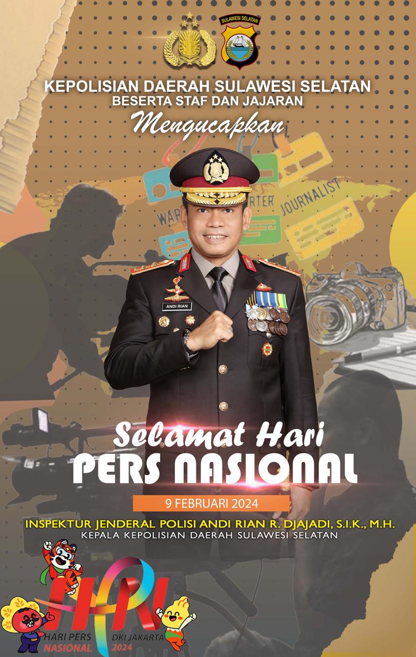 MAKASSAR, RAKYATSULBAR.COM— Kepala Kepolisian Daerah Sulawesi Selatan (Kapolda Sulsel), Irjen Pol Andi Rian Djajadi mengucapkan selamat Hari Pers Nasional (HPN) tahun 2024 kepada seluruh insan pers di Indonesia, dan secara umum di Sulsel.