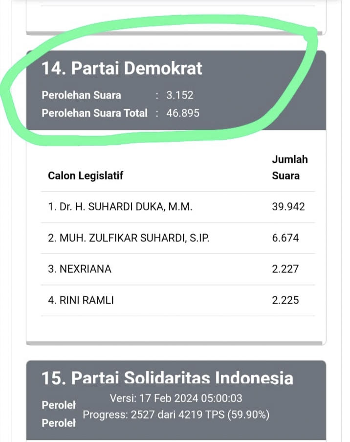 Dr. H. SUHARDI DUKA, M.M. 39.964, MUH. ZULFIKAR SUHARDI, S.IP. 6.675, NEXRIANA 2.232, RINI RAMLI 2.225, serta suara partai berjumlah 3.153.