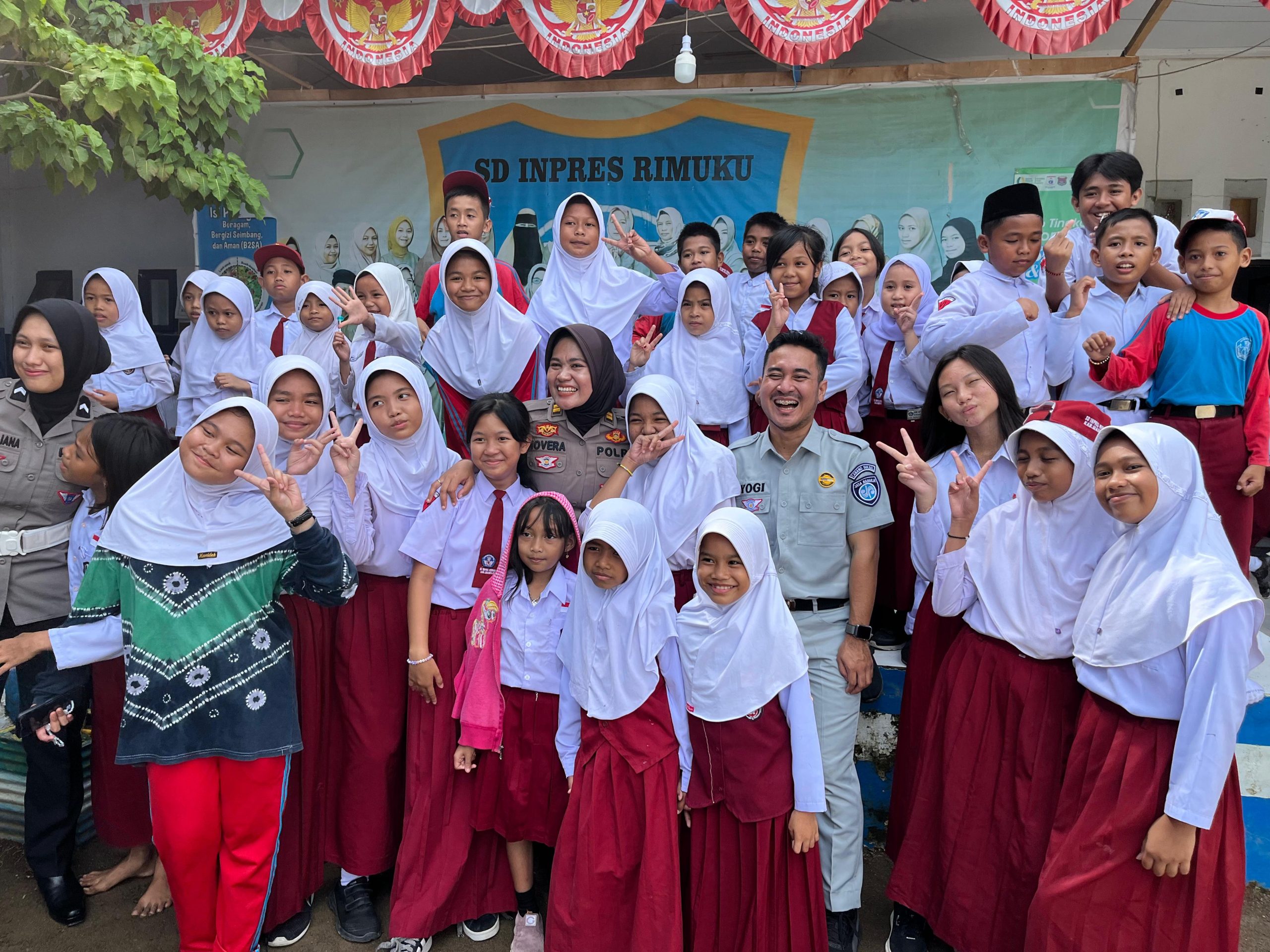 Di SD Rimuku terlihat Iptu Nopera bersama Jasa Raharja menyampaikan himbauannya kepada anak-anak tentang pentingnya keselamatan saat berkendara.