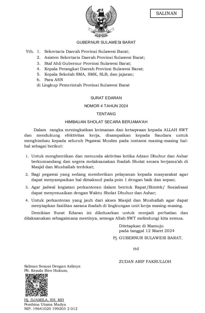 Ia mengatakan, Imbauan yang dikeluarkan Pemerintah Provinsi, Sulawesi Barat termuat dalam surat Edaran No. 4 tahun 2024 tentang Himbauan Shalat berjamaah di Masjid bagi ASN Muslim. Dalam surat imbauan tersebut terdapat beberapa poin yang harus dilakukan ASN lingkup Pemprov.