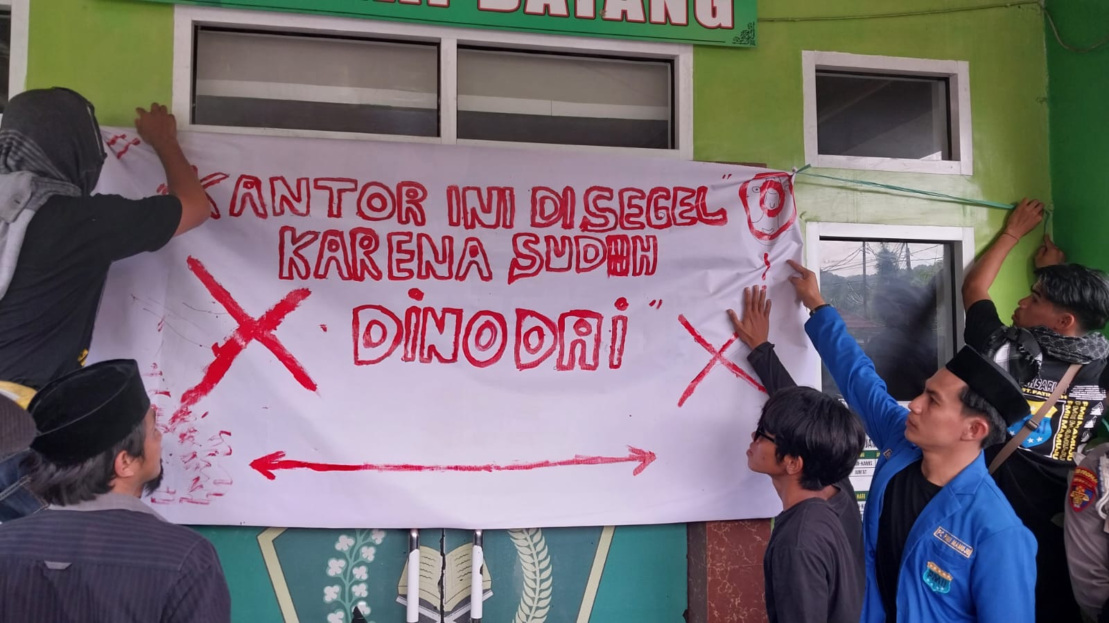Terlihat, Pergerakan Mahasiswa Islam Indonesia (PMII) Cabang Mamuju melakukan unjuk rasa didepan kantor Kementrian Agama (Kemenag) Sulawesi Barat, sekaligus menyegel Kantor dengan bertulisan “KANTOR INI DISEGEL KARENA SUDAH DINODAI”.