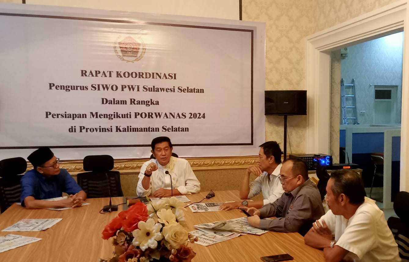 Rapat koordinasi SIWO Sulsel dipimpin oleh mantan Ketua PWI Sulsel, H. Zulkifli Gani Ottoh, yang ditugaskan untuk memimpin SIWO PWI Sulsel dalam persiapan tim atlet wartawan yang akan berpartisipasi dalam Pekan Olahraga Wartawan Nasional (Porwanas) 2024 di Provinsi Kalimantan Selatan.