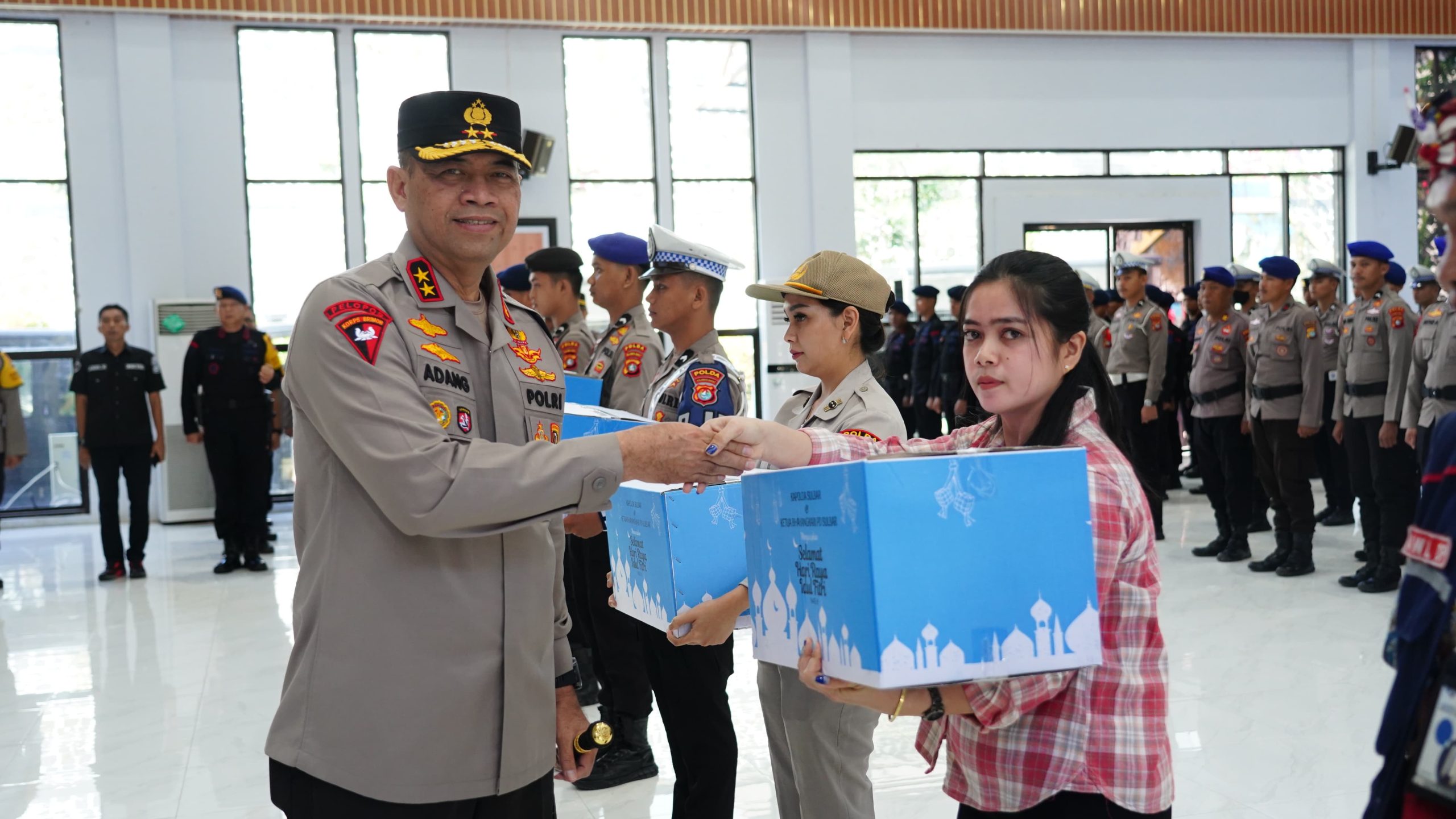 MAMUJU, RAKYATSULBAR.COM — Menyerahkan bingkisan parcel lebaran Idul Fitri 1445 Hijriah kepada perwakilan personel Polda Sulbar, PNS, PHL, Purnawirawan dan Wartawan, Kapolda Sulbar Irjen Pol Adang Ginanjar berharap kegiatan ini dapat dimaknai sebagai penguat tali silaturahmi baik sebagai keluarga besar maupun mitra Polda Sulbar.