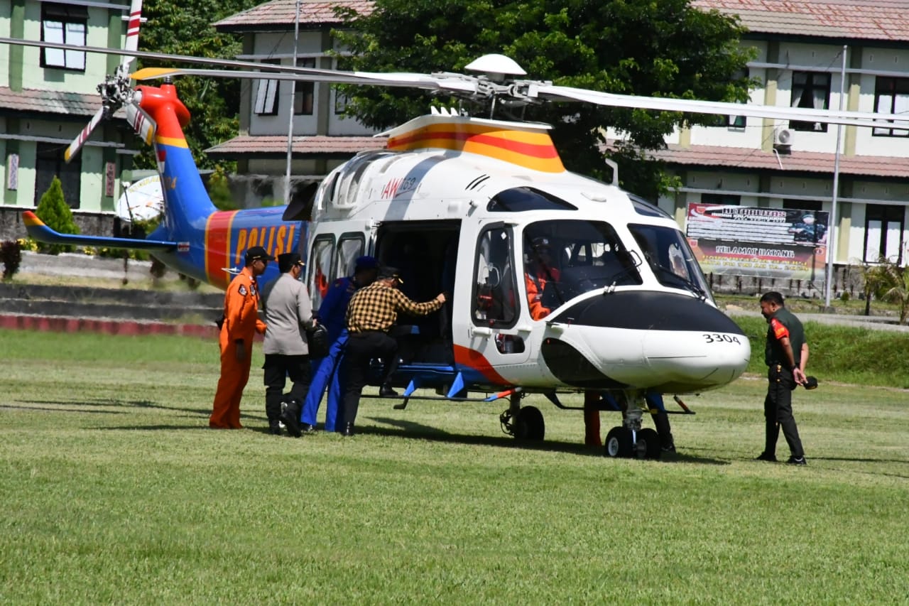 MAMUJU, RAKYATSULBAR.COM — PJ Gubernur Sulbar Prof Zudan Arif Fakrulloh bersama Panglima Daerah Militer XIV Hasanuddin Makassar, Mayjen TNI Bobby Rinal Makmun dan Kapolda Sulbar Irjen Pol Adang Ginanjar menggunakan helikopter meninjau lokasi yang akan dikunjungi presiden RI Joko Widodo, Sabtu (20/4/24).