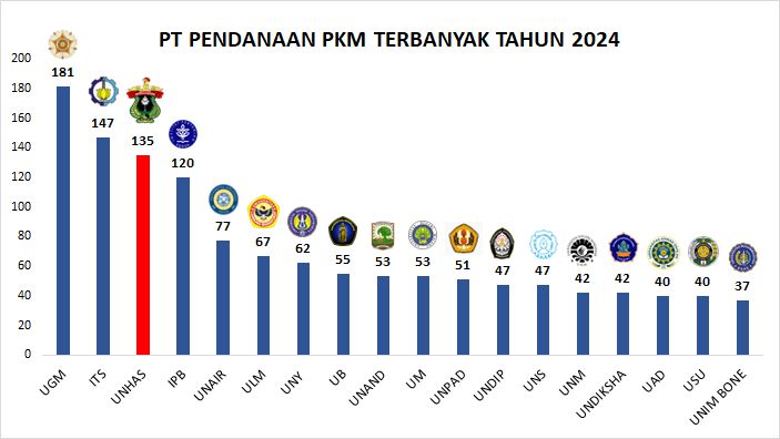 Lima besar perguruan tinggi terbanyak didanai berturut turut adalah UGM, ITS, Unhas, IPB, Unair.