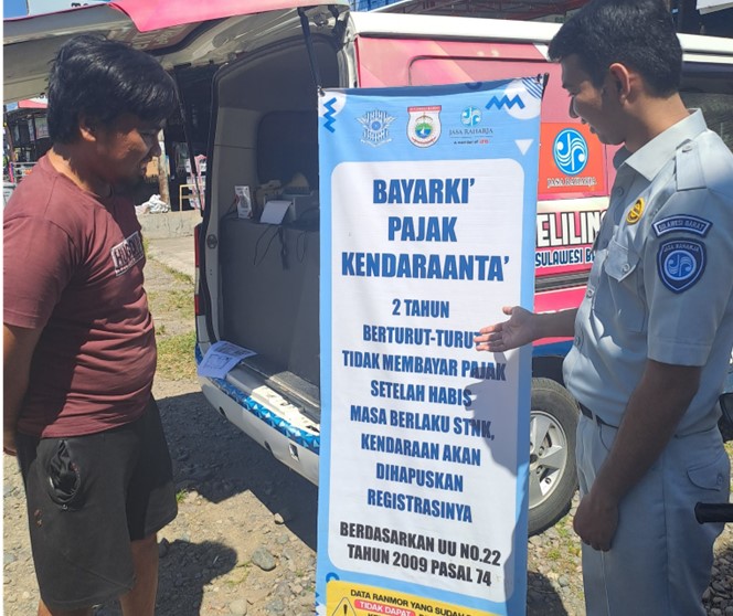 MAMUJU, RAKYATSULBAR.COM — Petugas Jasa Raharja Samsat Mamuju Sulawesi Barat, Ikhtiar mengikuti kegiatan pelayanan pembayaran pajak kendaraan bermotor menggunakan Mobil Samsat Keliling bersama UPTD Samsat Mamuju, Selasa (23/4/24).