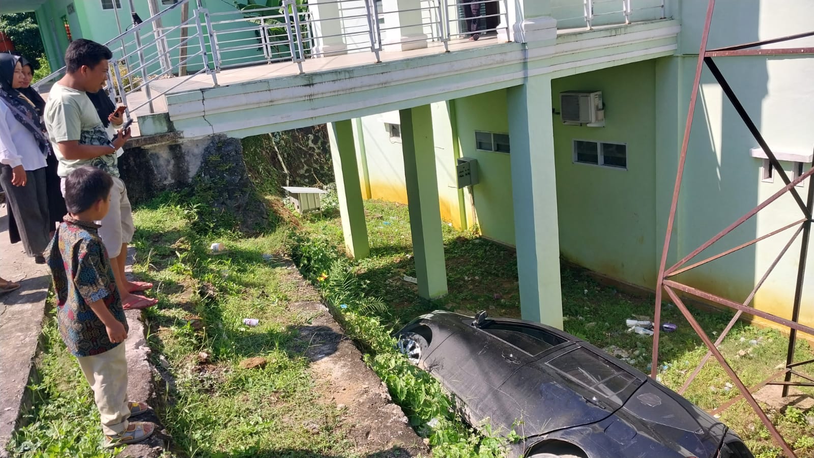 MAMUJU, RAKYATSULBAR.COM — Mobil Daihatsu Sigra dengan nomor polisi DC 1158 AL berwarna hitam milik Kepala Desa Tadui jatuh ke jurang depan rumah sakit daerah (RSUD) Mamuju, Jl. Kurungan Bassi, Kelurahan Mamuju, Kecamatan Mamuju, Kabupaten Mamuju, Sulawesi Barat (Sulbar), Rabu (22/5/24).
