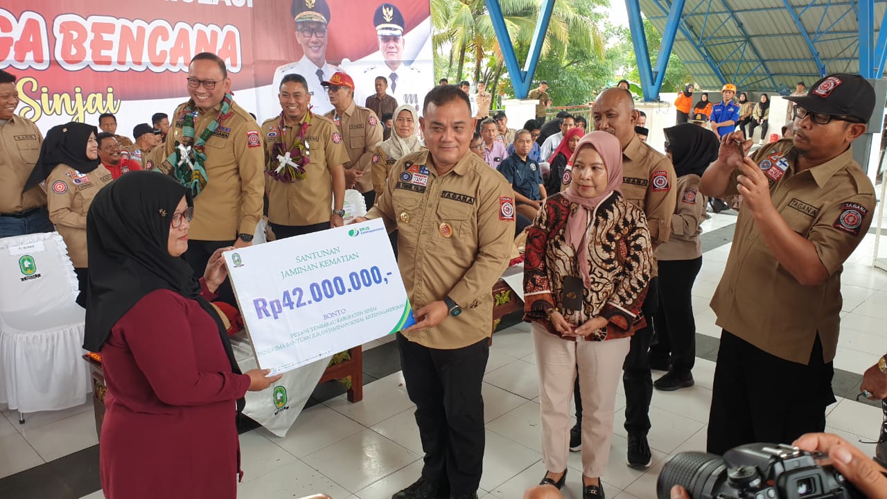 Penyerahan oleh pj. Bupati Sinjai didampingi oleh kadis sosial, dan kepala bpjs ketenagakerjaan cabang sinjai dan Disaksikan sekjen kemensos