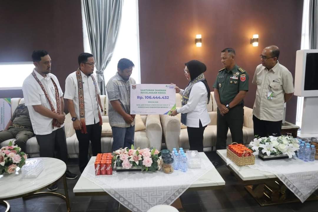MAMUJU, RAKYATSULBAR.COM — Ahli waris Almarhum Muhajar, salah seorang tenaga kebersihan pada DLHK kabupaten Mamuju, yang meninggal dunia usai mengalami kecelakaan, hari ini menerima santunan dari BPJS Ketenagakerjaan yang diserahkan oleh Bupati Mamuju, Sitti Sutinah Suhardi, bersama Kepala BPJS Ketenagakerjaan Provinsi Sulawesi Barat, Makmur.
