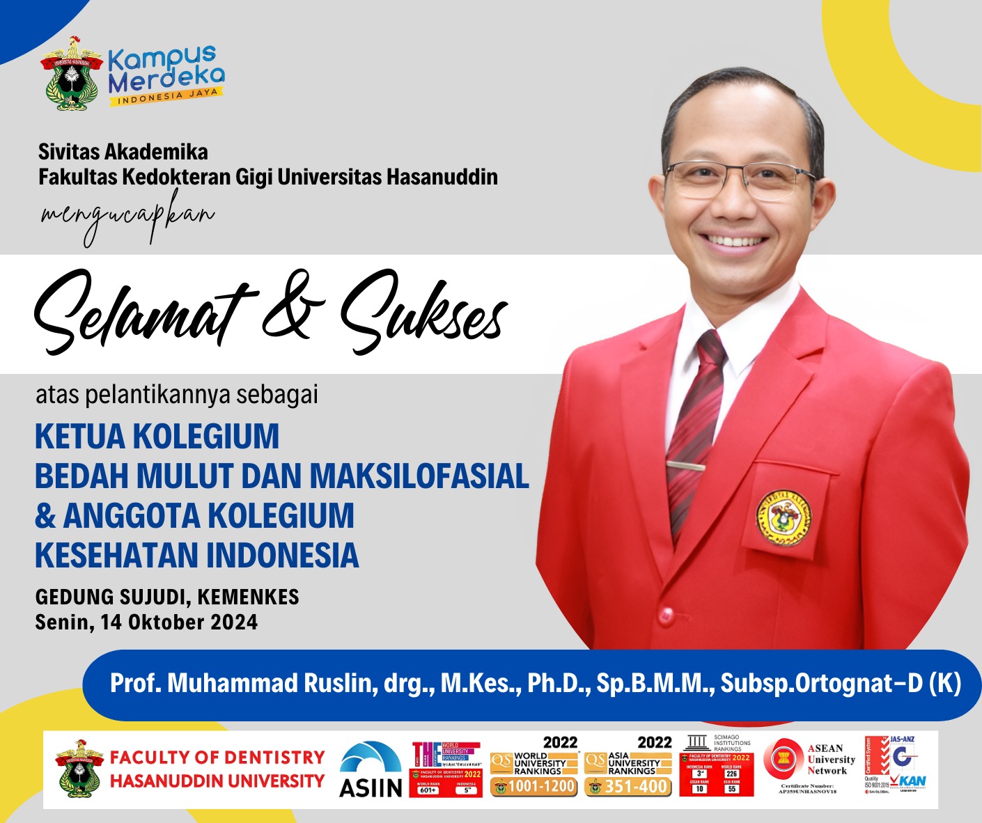Prof. Muhammad Ruslin, yang juga pernah menjabat Dekan Fakultas Kedokteran Gigi ini kembali membanggakan Unhas melalui posisi strategis ini.
