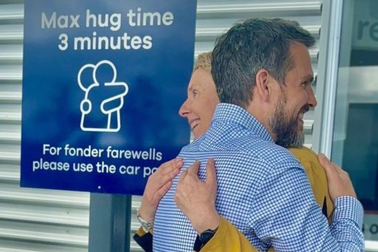 Larangan ini disampaikan lewat papan bercat biru dengan kalimat, “Max hug time 3 minutes. For fonder farewells please use the car park (Berpelukan maksimal tiga menit. Untuk perpisahan yang lebih hangat, silakan gunakan tempat parkir mobil)”.