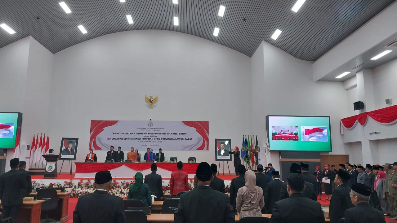 MAMUJU, RAKYATSULBAR.COM – Pelantikan pimpinan Dewan Perwakilan Rakyat Daerah (DPRD) Provinsi Sulawesi Barat (Sulbar) masa jabatan 2024 – 2029, di ruang rapat paripurna istimewa DPRD Sulbar dengan pengucapan sumpah atau janji pimpinan DPRD yang dipimpin Ketua Pengadilan Tinggi Sulbar, Andi Isna Renishwari Cinrapole, Selasa (29/10/2024).