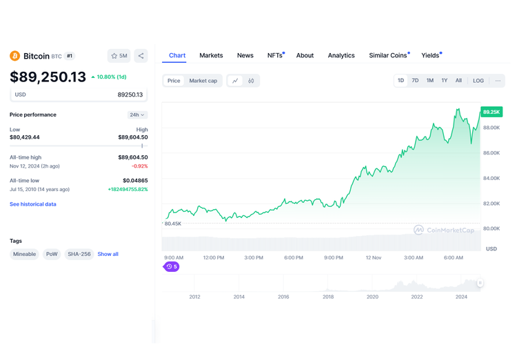 Harga Bitcoin (BTC) kembali mencetak rekor tertinggi sepanjang masa (all-time high/ATH) dengan tembus ke level 89.604 dollar AS atau sekitar Rp 1,411 miliar per keping pada Selasa (12/11/2024) pagi.