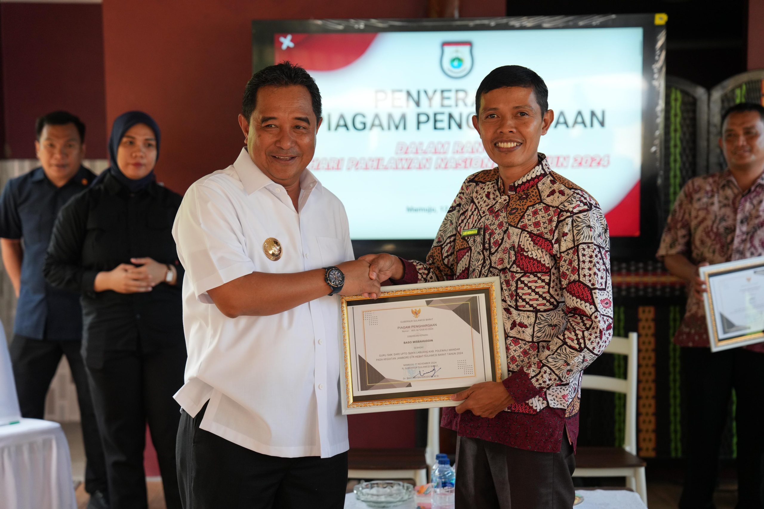 MAMUJU, RAKYATSULBAR.COM – Sebanyak 14 guru yang tersebar di seluruh kabupaten se Sulawesi Barat (Sulbar), Kadis DKP Sulbar, Suyuti Marzuki dan Kepala Desa Bonda, Abd Wahab, menerima penghargaan dari Pj Gubernur Sulbar, Bahtiar Baharuddin, Selasa (12/11/24).