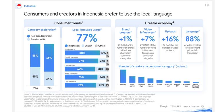 Selain gaming, kreator di sektor makanan dan minuman, fashion, dan film menjadi yang terbanyak di Indonesia. Menurut laporan Google, 88 persen kreator membuat konten video dengan bahasa Indonesia.