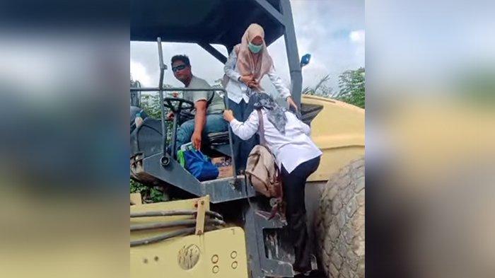 Di lokasi tersebut, kebetulan sedang dilakukan pengerjaan penimbunan jalan. Seorang operator Vibro Roller bersedia memberikan tumpangan kepada Metri dan Yunita agar mereka dapat melanjutkan perjalanan. Dalam video itu, terlihat Metri yang mengenakan rok memanjat alat berat tersebut terlebih dahulu, diikuti Yunita yang mengenakan celana. Barang-barang yang mereka bawa juga dinaikkan ke atas alat berat sebelum mereka memanjat.