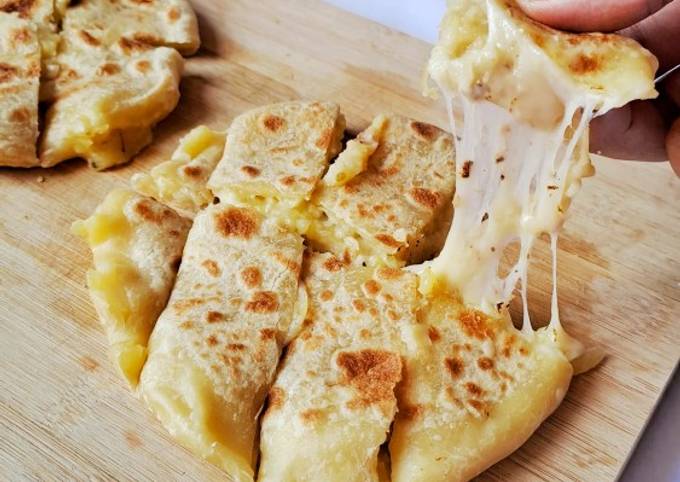 Pipihkan adonan, isi dengan campuran kentang dan keju mozzarella, lalu tutup rapat.