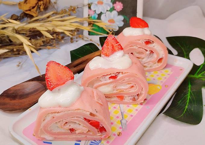 - Gulung crepe dengan hati-hati hingga membentuk roll cake.
