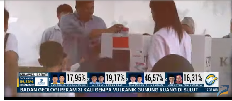 Terlihat pada Live di MetroTV pukul 17.32 WIB menunjukkan quick count Indikator Politik Indonesia menunjukkan persentase suara masuk sudah mencapai 17,33 persen.