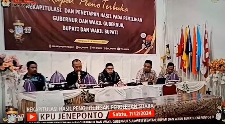 Dalam rapat pleno yang juga turut dihadiri oleh para saksi pasangan calon bupati dan wakil bupati, komisioner Bawaslu Jeneponto, unsur Muspida dan anggota Panitia Pemilihan Kecamatan (PPK), KPU Jeneponto menetapkan perolehan suara Pilkada Jeneponto.
