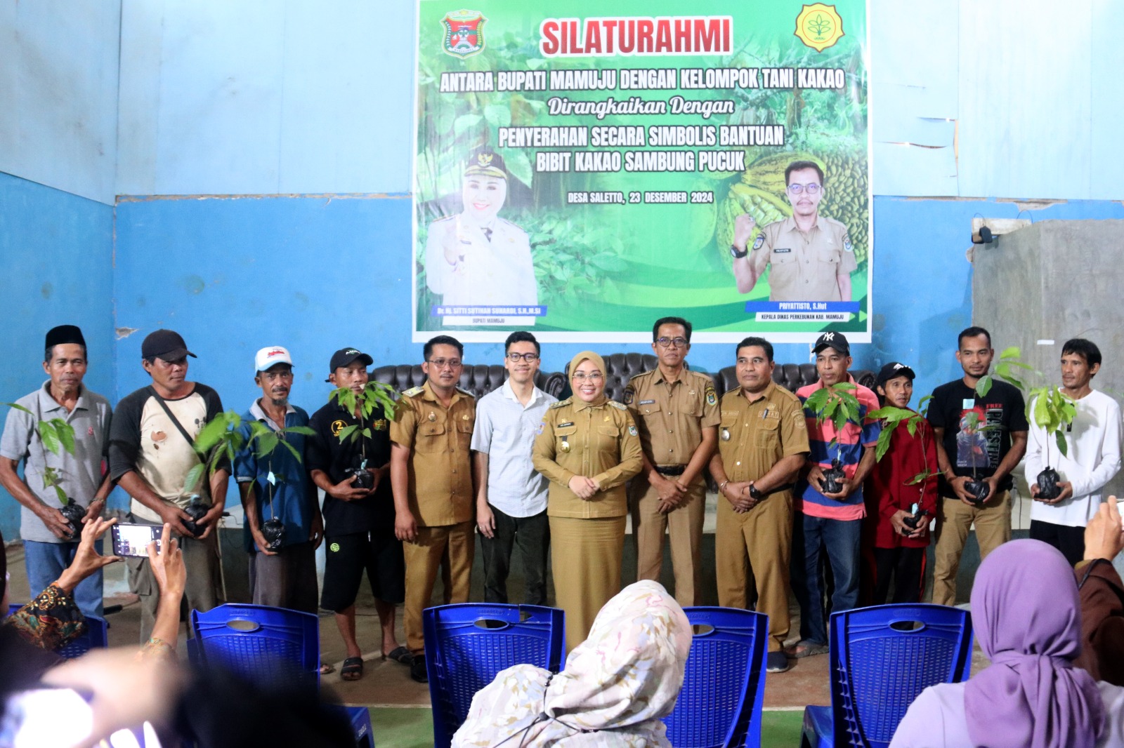 MAMUJU, RAKYATSULBAR.COM –– Bupati Mamuju Dr.Hj.Sitti Sutinah Suhardi, bersama dengan anggota DPR RI Zulfikar Suhardi, menyerahkan bantuan bibit kakao sambung pucuk kepada sejumlah kelompok tani yang secara seremoni dilakukan di desa Salletto Kecamatan Simboro.