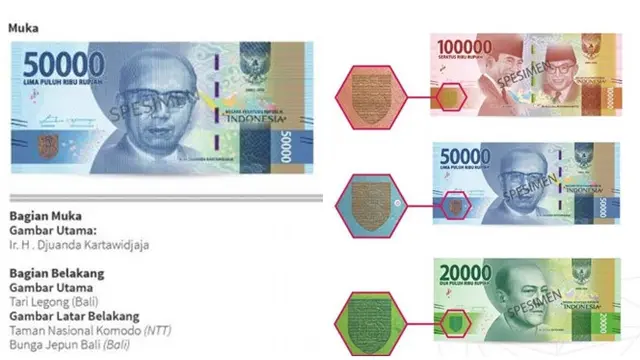 Perubahan warna benang pengaman pada pecahan Rp100.000 dan Rp50.000, perisai logo BI pada pecahan Rp100.000, Rp50.000, dan Rp20.000. Menemukan angka berubah warna yang tersembunyi pada pecahan Rp100.000, Rp50.000, Rp20.000, Rp10.000, dan gambar tersembunyi berupa tulisan BI dan angka.